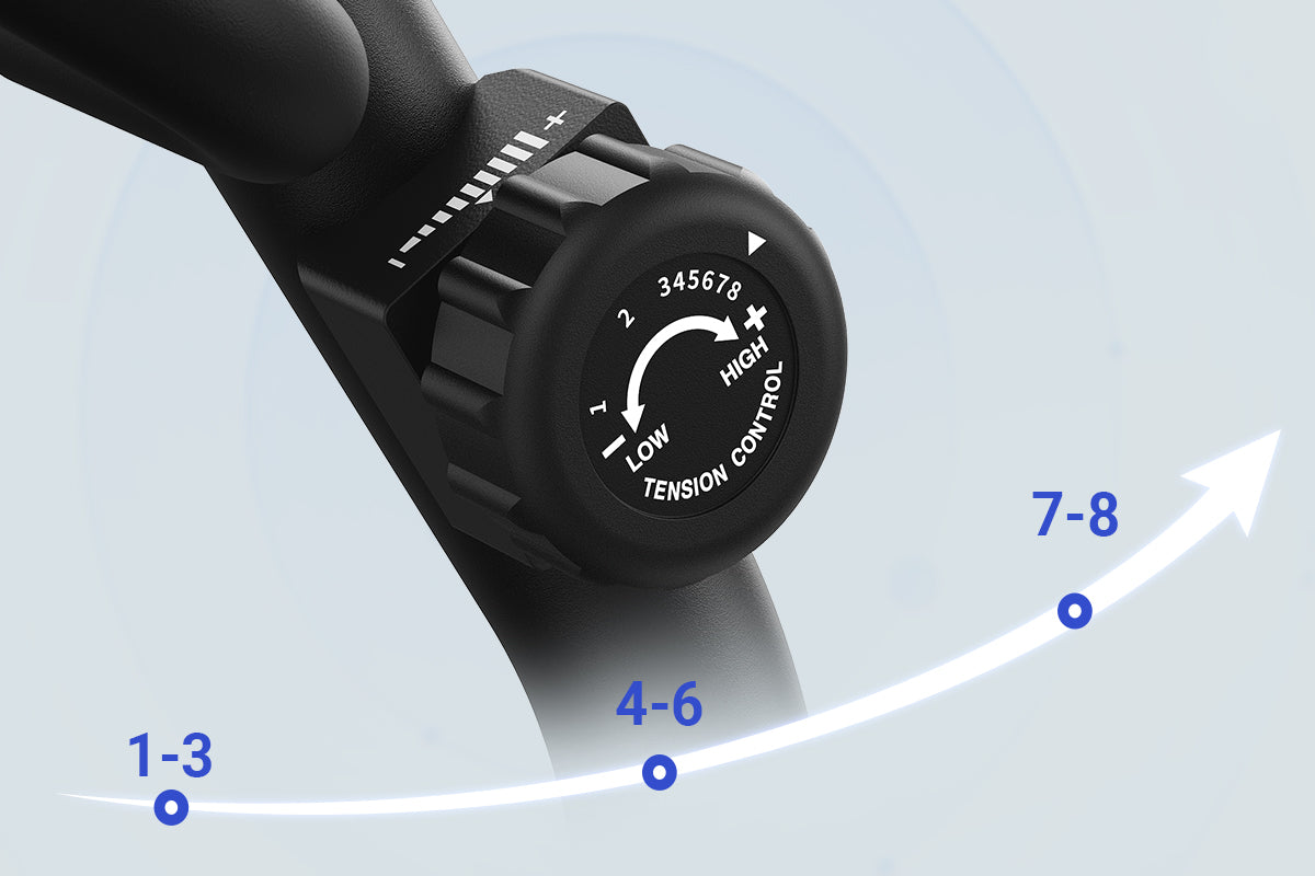 Le régulateur de résistance latéral permet un réglage facile sur 8 niveaux – de léger à difficile. Avec une résistance maximale de 32kg, l’appareil propose également un entraînement efficace pour les utilisateurs avancés.